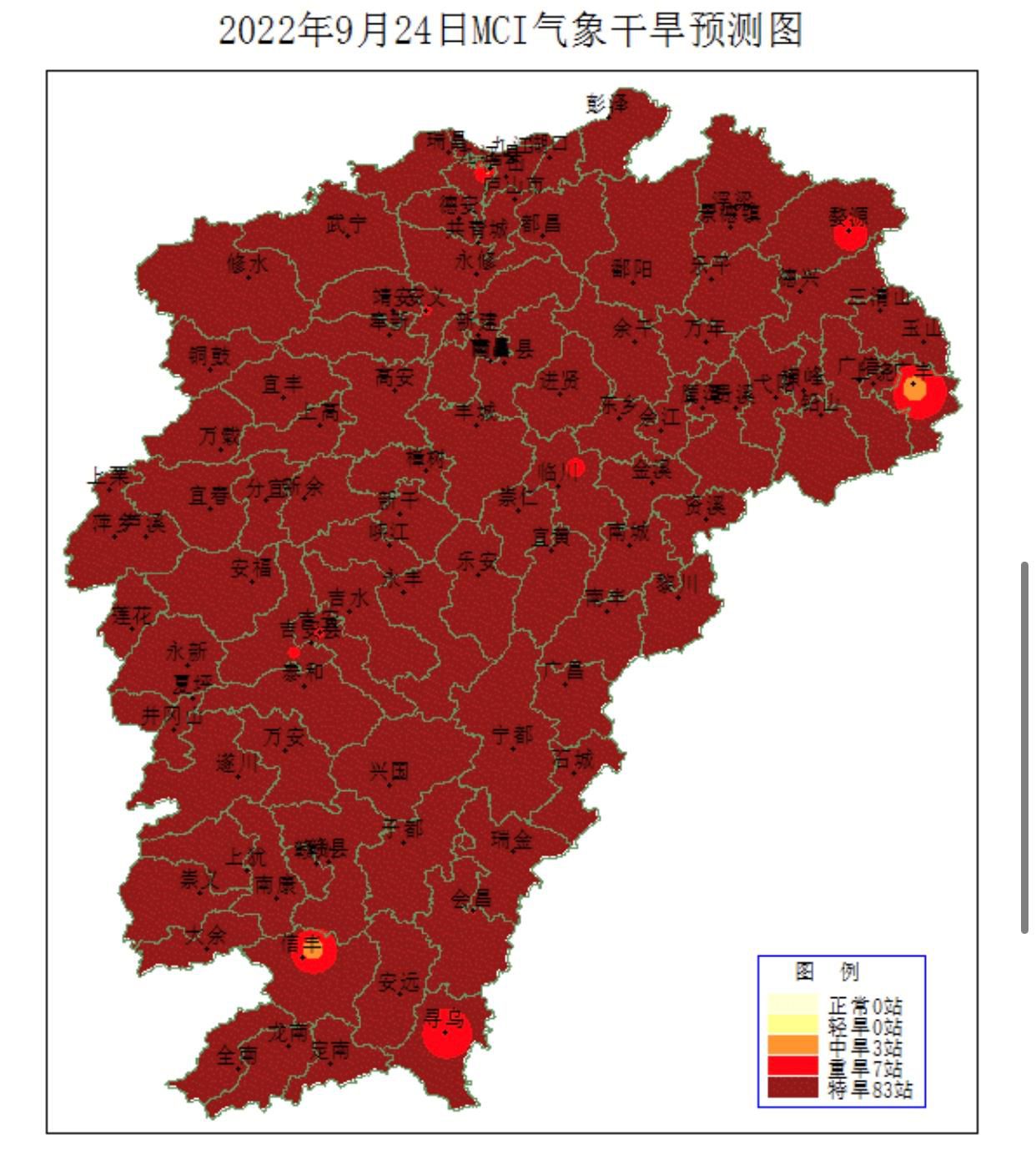 9月22日综合气象干旱指数监测显示,江西有95%的县(市、区)达到特旱,预计未来7天全省气象干旱仍将持续,请各地各有关部门继续做好干旱防御工作,城乡居民注意节约用水。