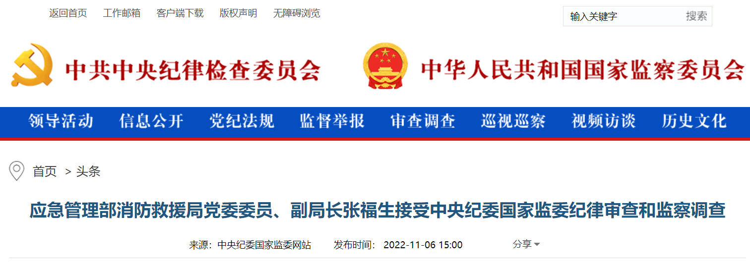 应急管理部消防救援局党委委员、副局长张福生被查 2022-11-06中央纪委国家监委网站 中央纪委国家监委网站讯 应急管理部消防救援局党委委员、副局长张福生涉嫌严重违纪违法,目前正接受中央纪委国家监委纪律审查和监察调查。 编辑:郭同欢
