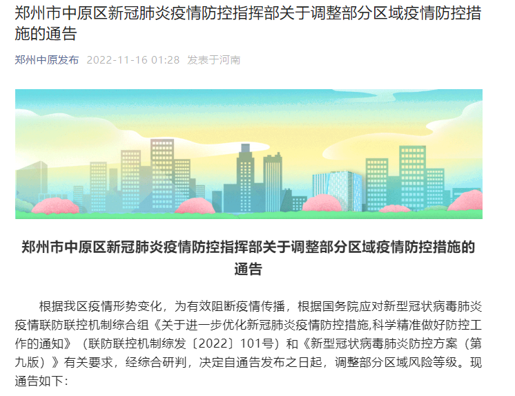 郑州市中原区新冠肺炎疫情防控指挥部关于调整部分区域疫情防控措施的通告