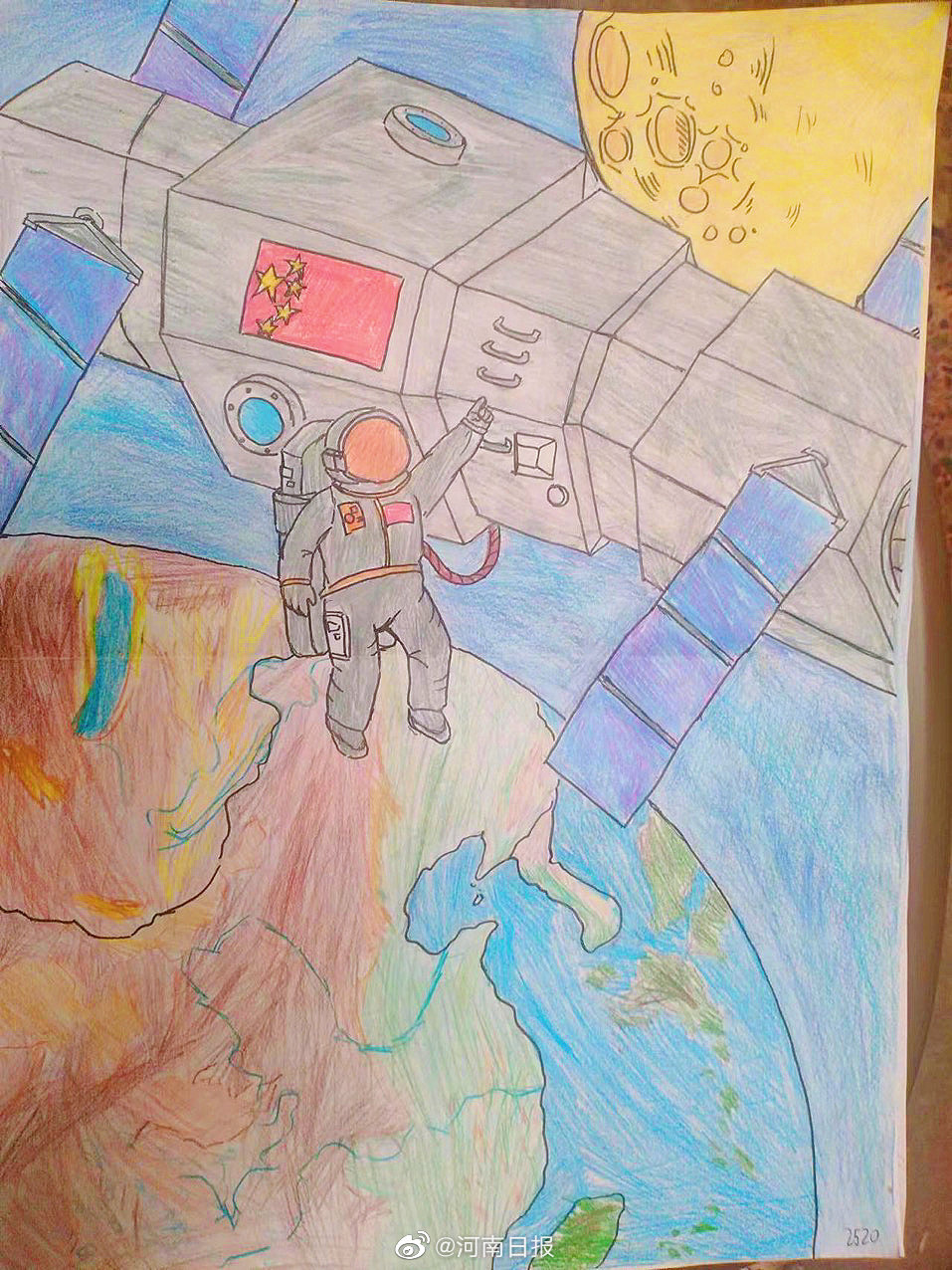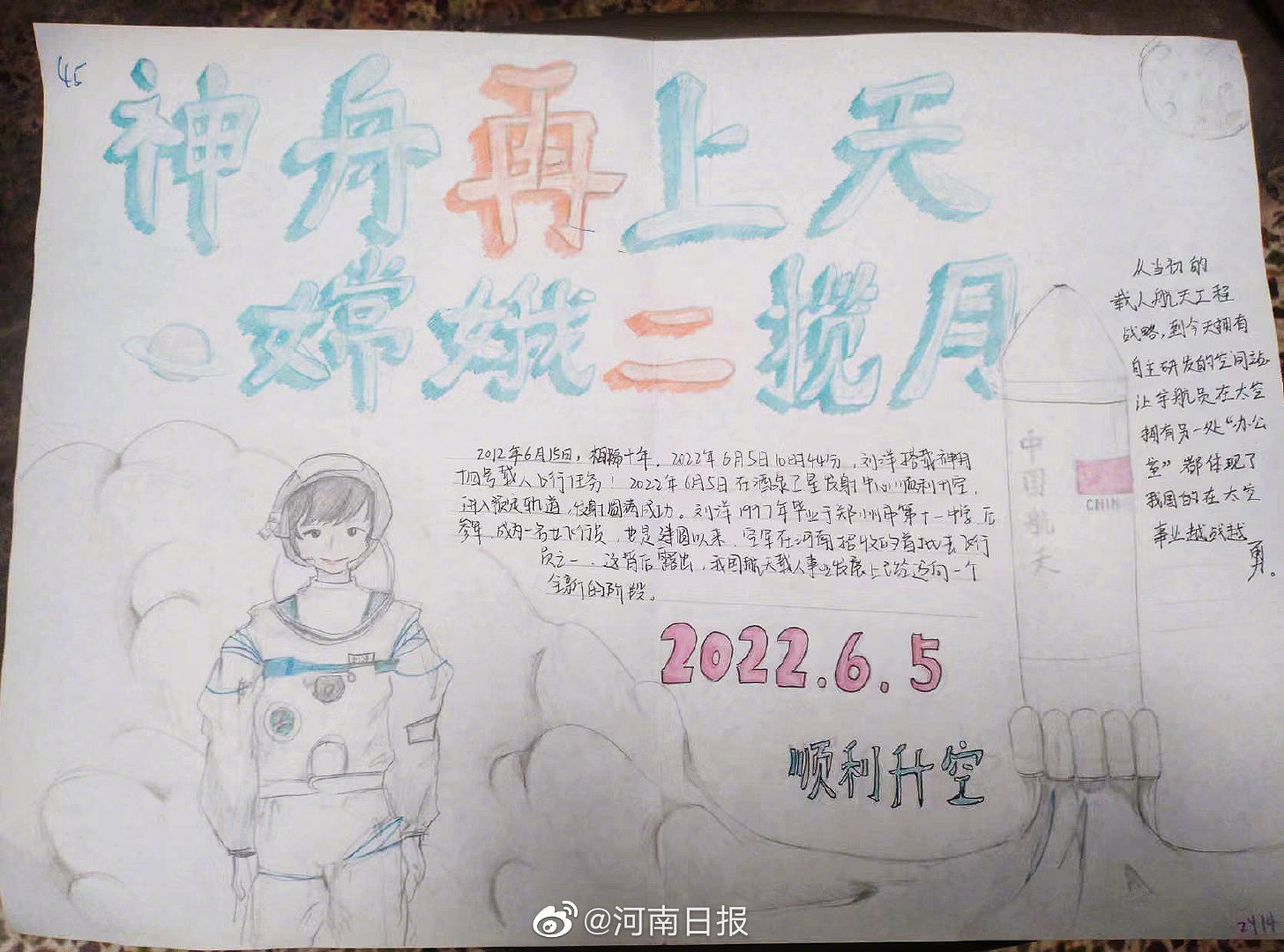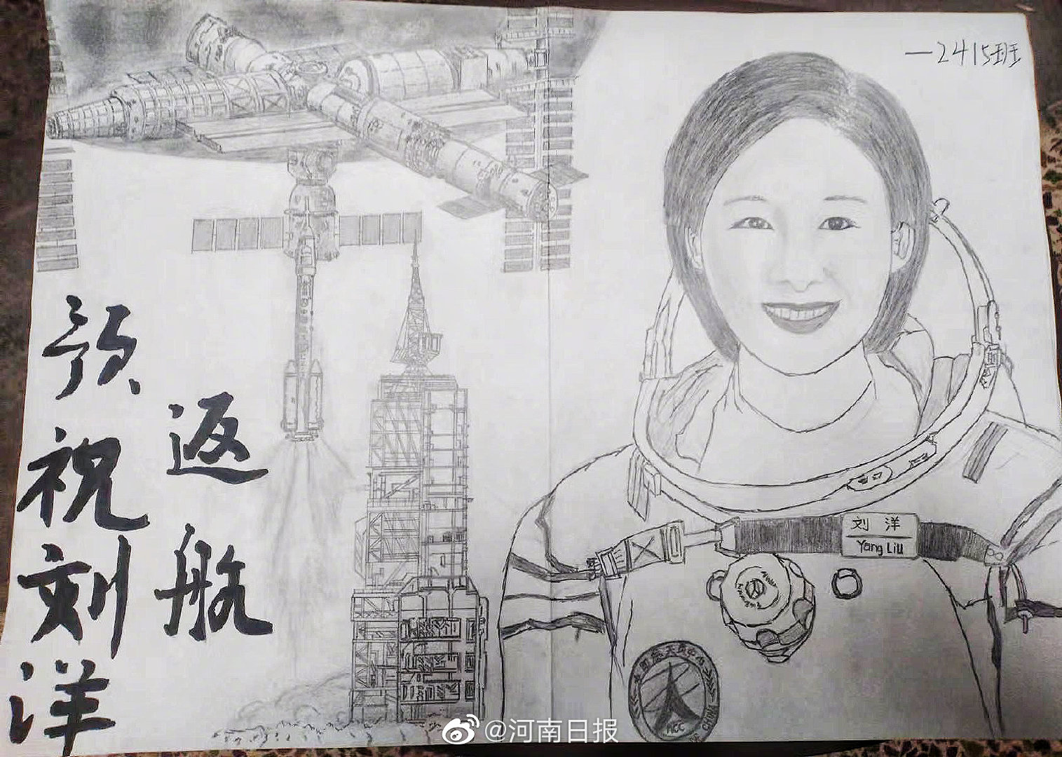 “等这天很久了,看到刘洋学姐即将返回的消息后,内心很激动,也为母校感到自豪。”郑州市第十一中学高二学生王子睿,学习之余抽出时间,亲手绘制了一幅航天图画,预祝刘洋学姐顺利返航。