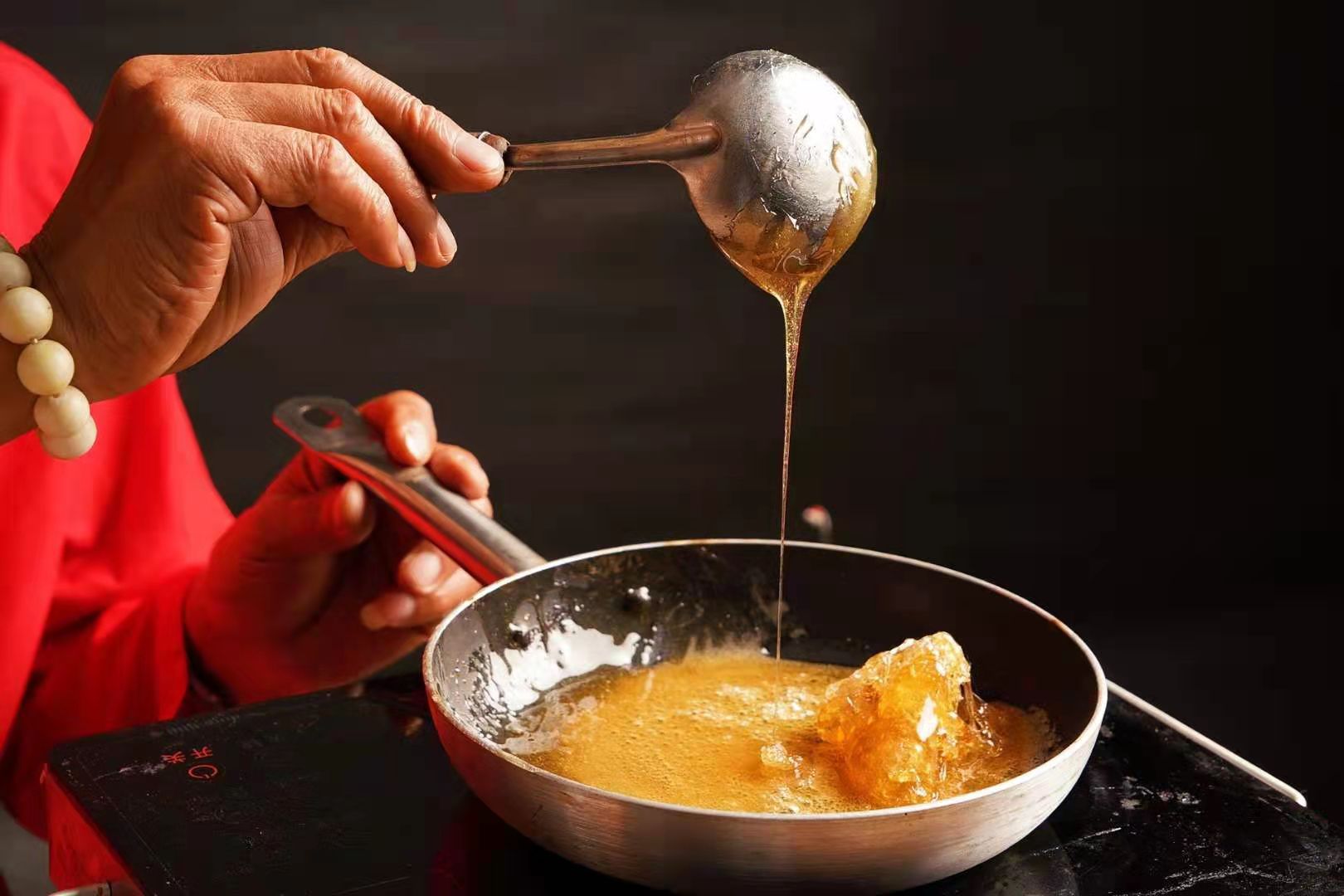 在视频中,王新廷手持汤勺,挥洒之间,温热的糖汁逐渐成形:腾云驾雾的飞龙、翔舞于空的凤凰、惟妙惟肖的十二生肖……当造型完成后,他用小铲刀将糖画铲起,粘上竹签,一幅幅晶莹剔透、活灵活现的糖画作品就此完成。