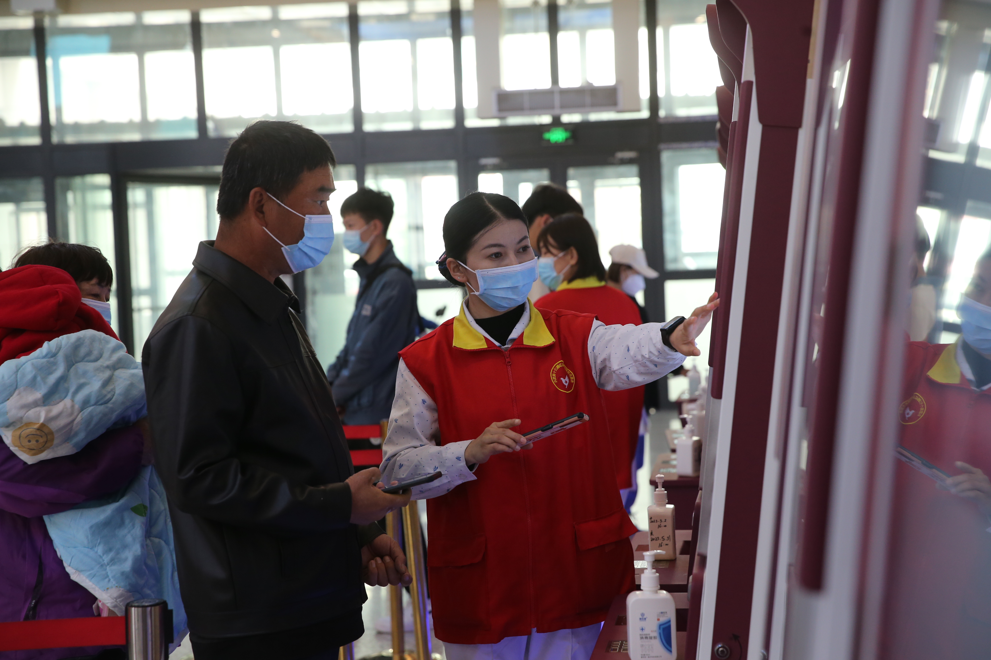 兵团第十三师新星市红星医院,工作人员指导患者进行智能化导诊服务。
