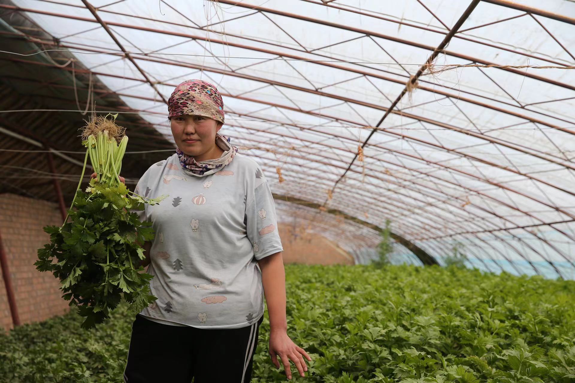 巴里坤县黄土场蔬菜种植基地,巴彦德村村民玛丽亚·沙阿提正收获蔬菜。