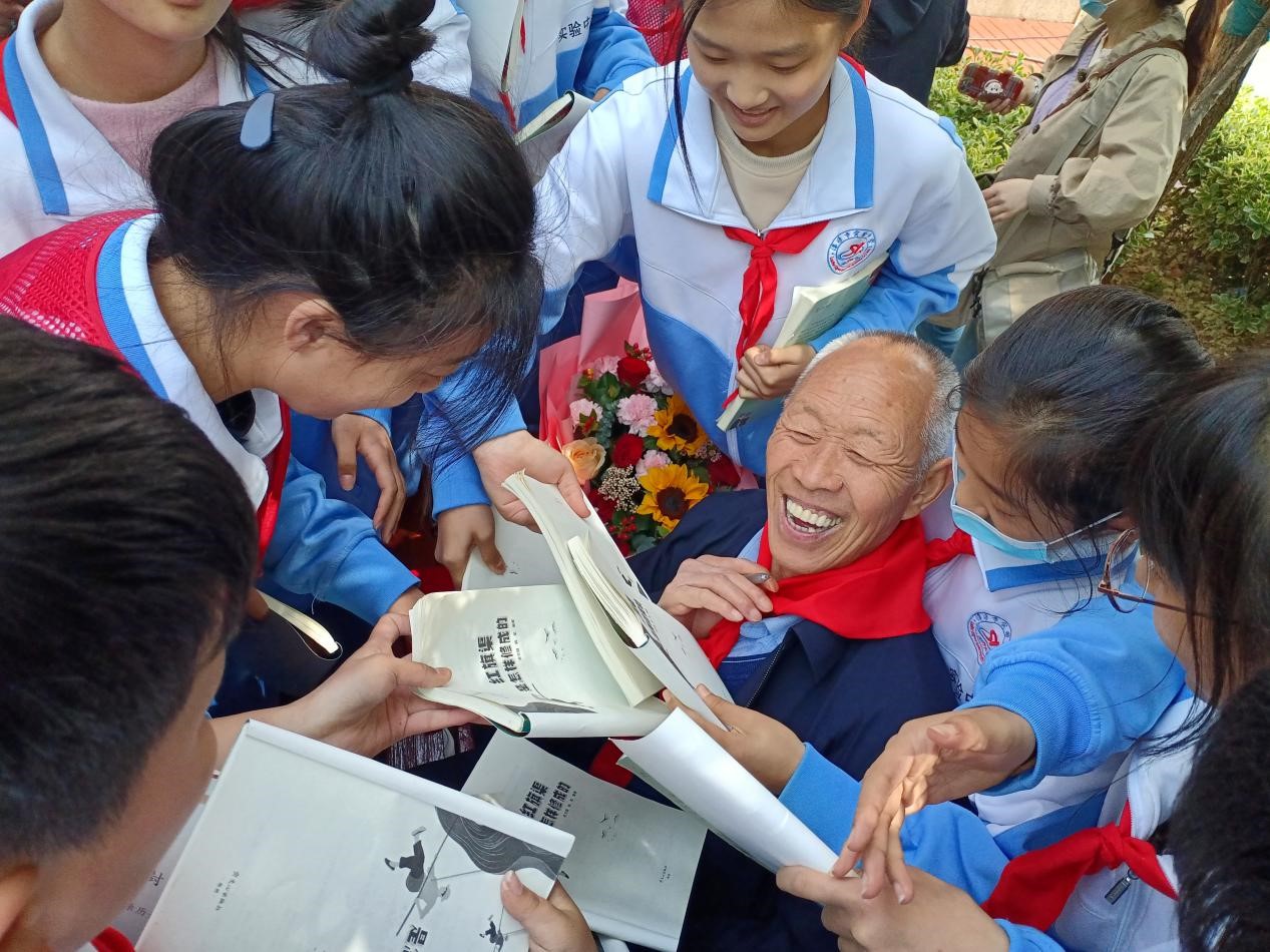 活动间歇,大家围住老人,拿着书本等他签名。“老一辈修渠人正在成为孩子们心中的‘星’。”刘书焕说。