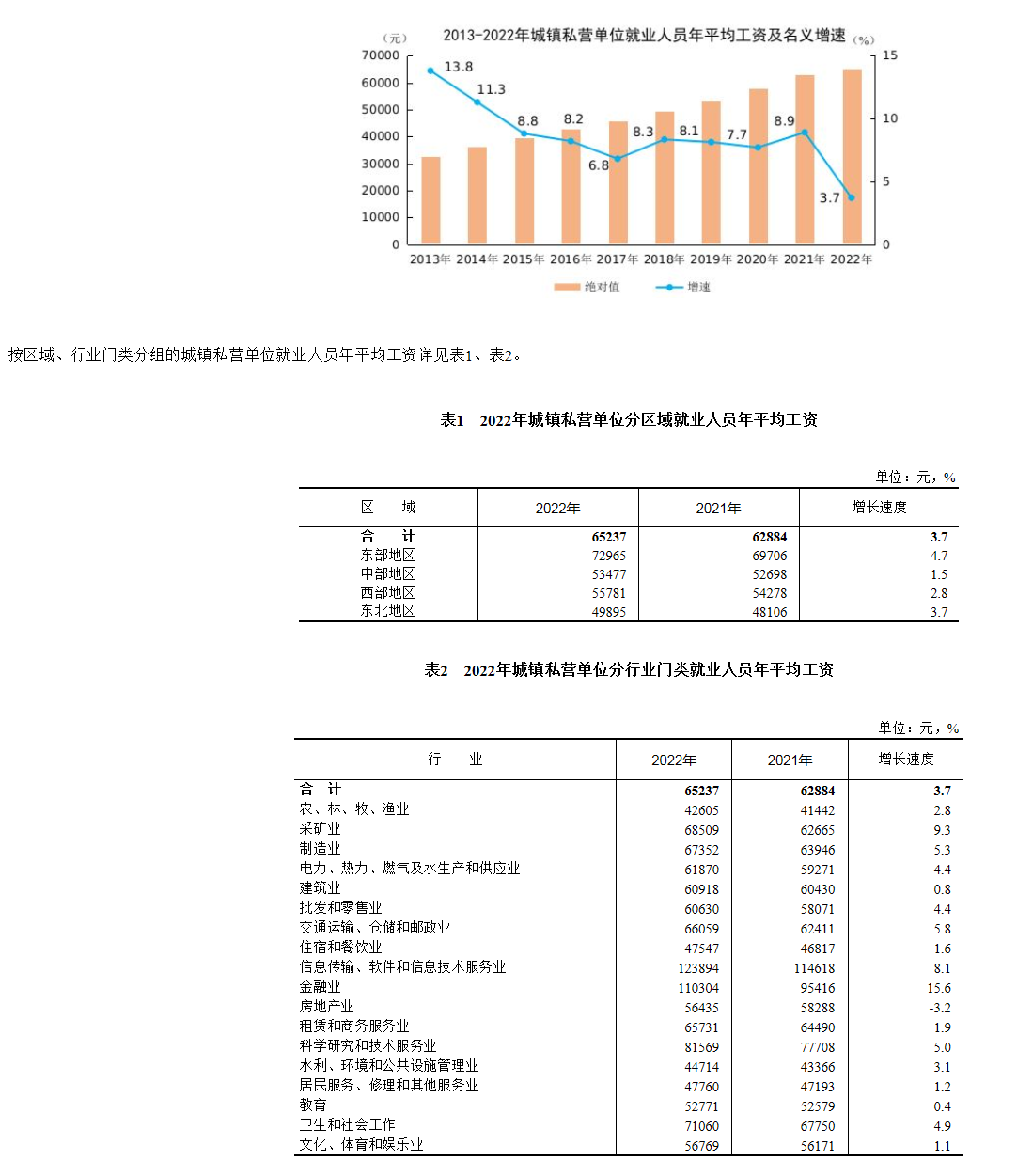 2022年全国城镇私营单位就业人员年平均工资为65237元,比上年增加2353元,名义增长3.7%。扣除价格因素,2022年全国城镇私营单位就业人员年平均工资实际增长1.7%。