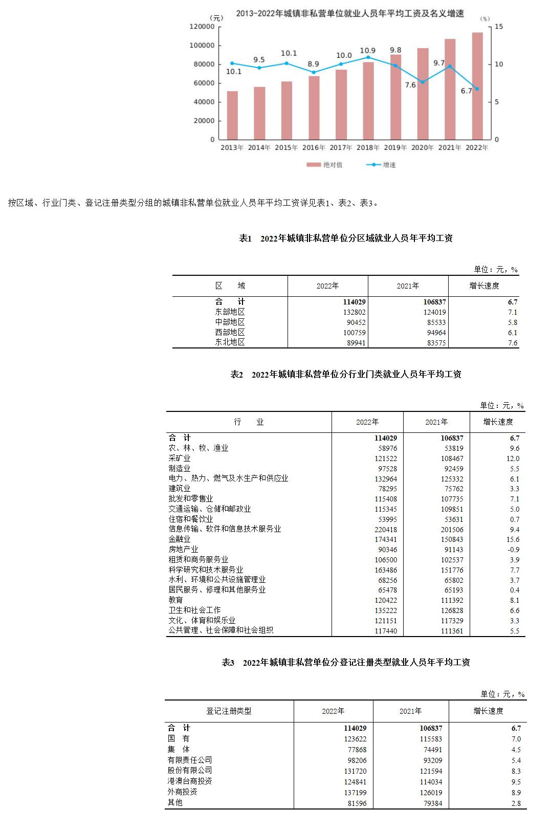 2022年全国城镇非私营单位就业人员年平均工资为114029元,比上年增加7192元,名义增长6.7%。扣除价格因素,2022年全国城镇非私营单位就业人员年平均工资实际增长4.6%。