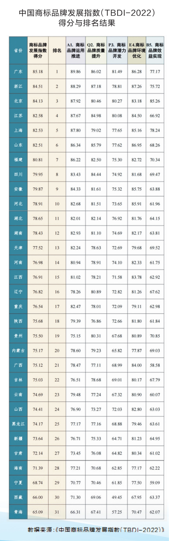中国商标品牌发展指数(TBDI-2022)得分与排名结果数据来源:《中国商标品牌发展指数(TBDI-2022)》