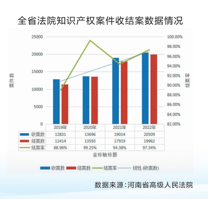 司法保护持续增强为品牌建设提供强有力的法治保障。创新是引领发展的第一动力,保护知识产权就是保护创新。在知识产权案件审结方面。2022年,河南全省法院共受理各类知识产权案件20509件,同比增长7.86%,审结19962件,结案率97.34%,比2021年全年结案17919件增加2043件,增幅11.41%。妥善审结了一批疑难复杂和具有重大影响的典型案件,比如“郑麦113”小麦植物新品种侵权案、“彩甜糯6号”杂交玉米亲本植物新品种侵权案、“鲁丽”苹果植物新品种侵权案等。在商标权、著作权案件审理方面。2022年,全省法院新收一审商标权、著作权纠纷案件13705件,占全部新收一审知识产权案件80.57%,新收二审商标权、著作权纠纷案件1307件,占全部新收二审知识产权案件77.99%。强化商业标识权益保护,河南依法严惩商标攀附、仿冒搭车等侵权违法行为,加大对驰名商标、知名品牌、老字号的保护力度,坚决制止恶意抢注、囤积商标等扰乱商标注册使用秩序行为。审结侵害“宇通”“好想你”“双汇”“花花牛”“莲花味精”“卫龙”等一批省内知名品牌和“三一”“云南白药”“江中”“农夫山泉”“绿地”“飞科”“宝岛”“茅台”“五粮液”等全国知名商标侵权案件,制裁傍名牌、蹭知名度的不正当行为。突出农业知识产权保护。种子是粮食的“芯片”。植物新品种保护事关国家粮食安全,事关乡村振兴。在重大政策方面,省委省政府印发《关于加快构建一流创新生态建设国家创新高地的意见》,提出充分发挥知识产权审判激励创新创造、维护公平竞争、促进文化繁荣等职能作用,为贯彻新发展理念、构建新发展格局、推动高质量发展提供有力司法服务保障。