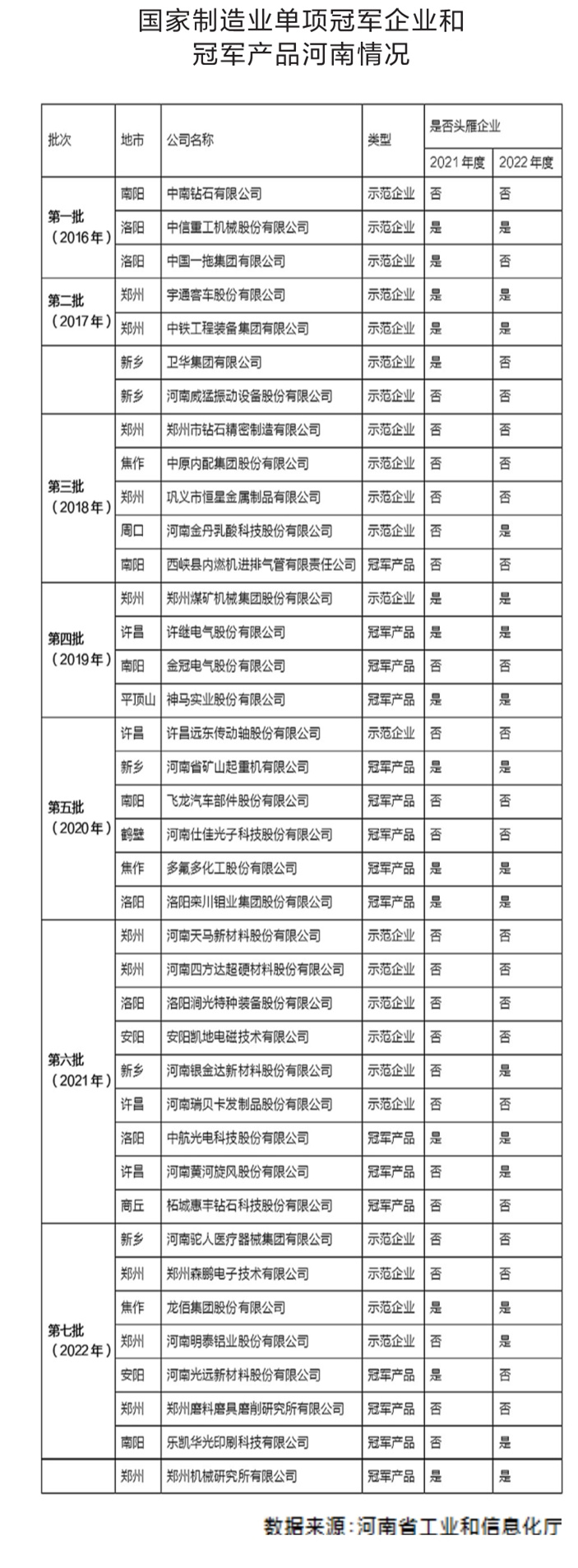 国家制造业单项冠军企业和冠军产品河南情况数据来源:河南省工业和信息化厅