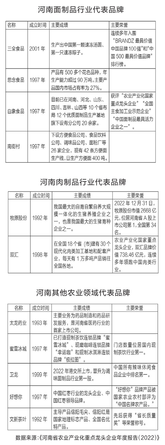 从农业品牌建设看。一是传统品牌实力强劲。我省多个品牌在全国具有较大的影响力,如面及面制品行业的三全、思念、想念、白象等;肉制品行业的双汇、牧原、华英等;乳制品行业的花花牛等;果蔬行业的好想你、二仙坡等;中药材行业的宛西、羚锐、福森、太龙等;调味品行业的十三香、仲景等;特色行业的怀山堂、文新、金丹、米多奇等一大批品牌产品具有较高的市场知名度。二是新兴农业品牌快速崛起。近年来,随着消费升级,涉农企业产业链不断延伸。在新兴细分赛道,河南涌现了一批知名度较高的涉农企业,如网红茶饮品牌蜜雪冰城、为餐饮酒店提供全面供应解决方案的千味央厨、“辣条第一股”卫龙以及嗨吃家、食族人、丽星食品、豫道等酸辣粉品牌。三是农业品牌质量效益好。2022年,在国内多项重要评选中,都出现了河南涉农龙头企业的身影。2022年12月,农民日报社评选出《2022中国农业企业500强》,三全食品、大咖国际食品、华英农业、想念食品、恒都食品、莲花集团、飞天生物、中沃实业、训达粮油、豫储物流、好想你、泰利机械等豫企均入围500强榜单。2022年12月18日,胡润研究院发布《胡润中国食品行业百强榜》。河南企业牧原食品以3000亿元的价值进入前十名,位列第七。双汇、三全、卫龙等河南企业进入百强。四是农业品牌行业影响力大。河南各地举办了中国(通许)酸辣粉行业大会、中国(原阳)预制菜行业大会、中国(商丘·永城)面粉食品博览会等多场农业细分领域的大会,豫农优品助推“河南味道”走向全国。