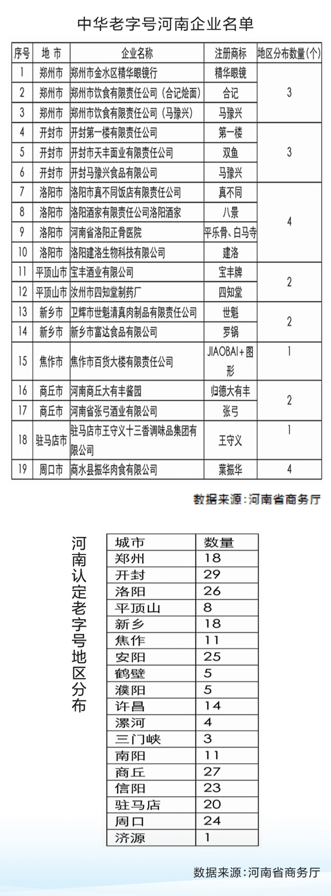 2022年,河南省政府办公厅《关于促进老字号创新发展的实施意见》提出,力争到“十四五”末,全省老字号企业整体营收规模超过400亿元,认定中华老字号品牌超50个、河南老字号品牌超320个。