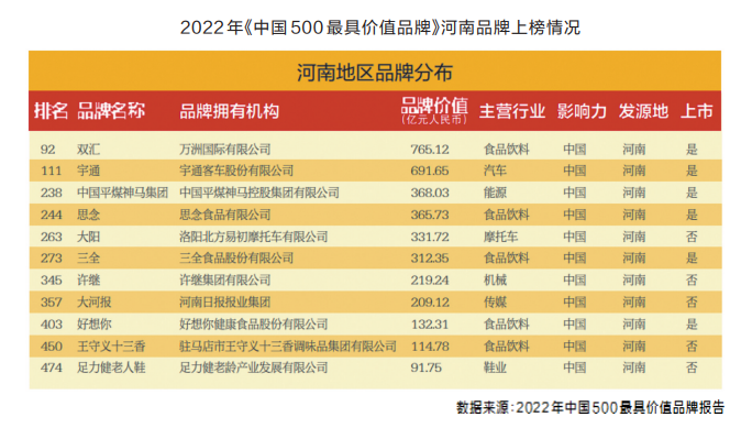 2022年《中国500最具价值品牌》河南品牌上榜情况数据来源:2022年中国500最具价值品牌报告