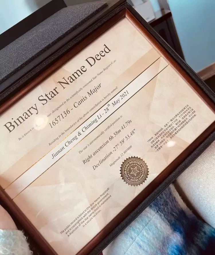 程女士还曾在朋友圈发布一张“双子星名契”(binary star name deed)的证书照片。该照片显示,他俩以双方名字共同命名了一颗星。证书上的时间为2021年5月28日。