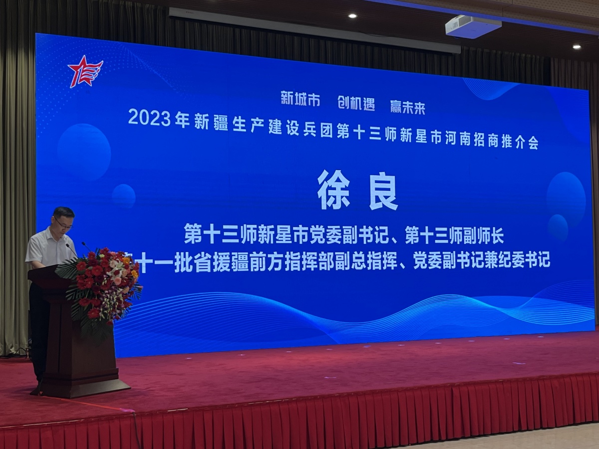 十三师新星市党委副书记、十三师副师长徐良致辞,热情向参加招商会的企业家们发出前来师市考察投资的邀请。河南省工业和信息化厅党组成员、副厅长孙永民出席推介会并致辞。十三师新星市党委常委、十三师副政委潘朝印参加推介会,并代表师市党委与河南农业大学、河南工业和信息化职业学院签署战略合作协议。