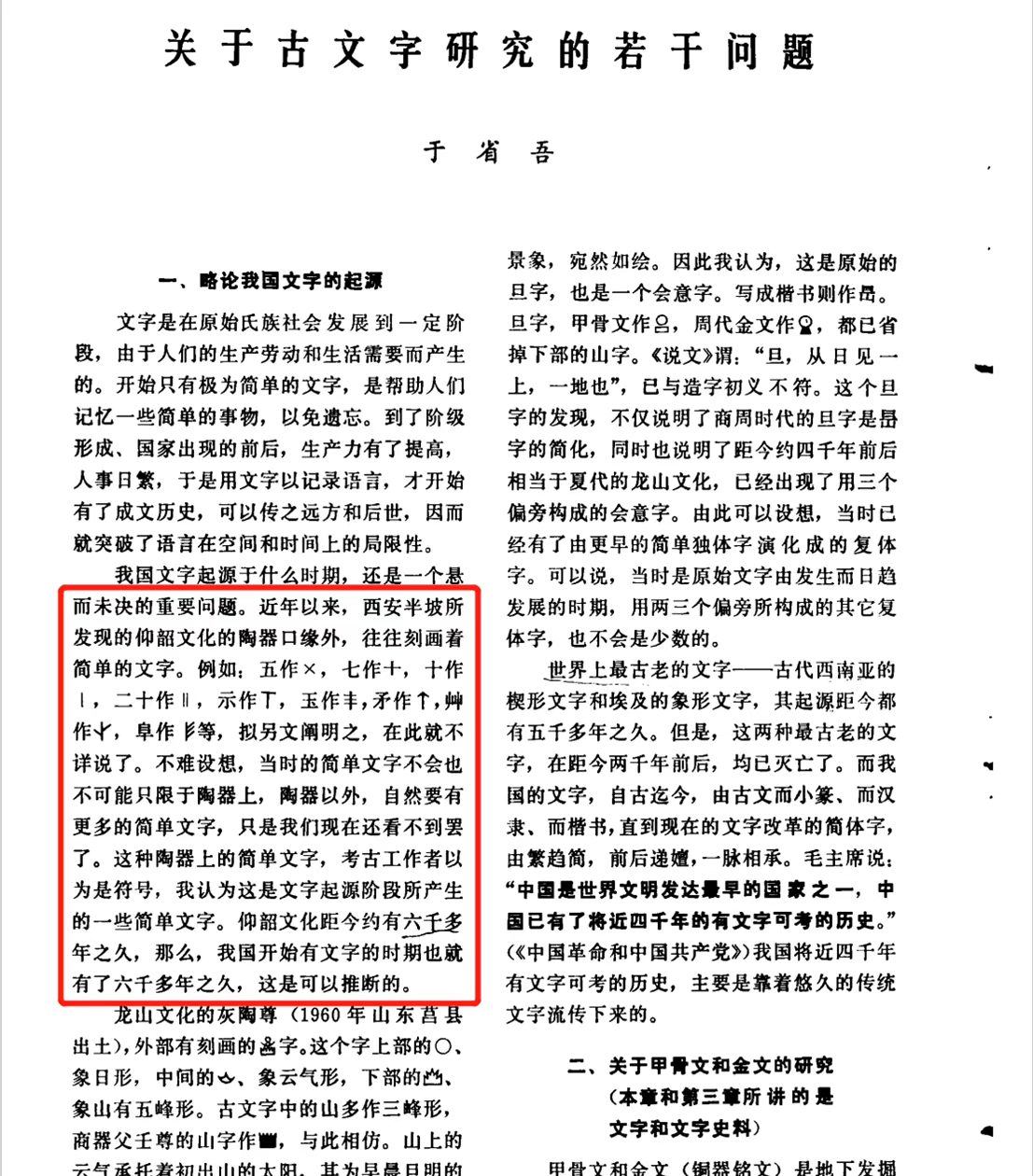 于省吾在其所写的《关于古文字研究的若干问题》中表示,“陶器上的简单文字,考古工作者以为是符号,但我认为这是文字起源阶段所产生的一些简单文字。仰韶文化距今约有六千多年之久,那么,我国开始有文字的时期也就有了六千多年之久,这是可以推断的。”