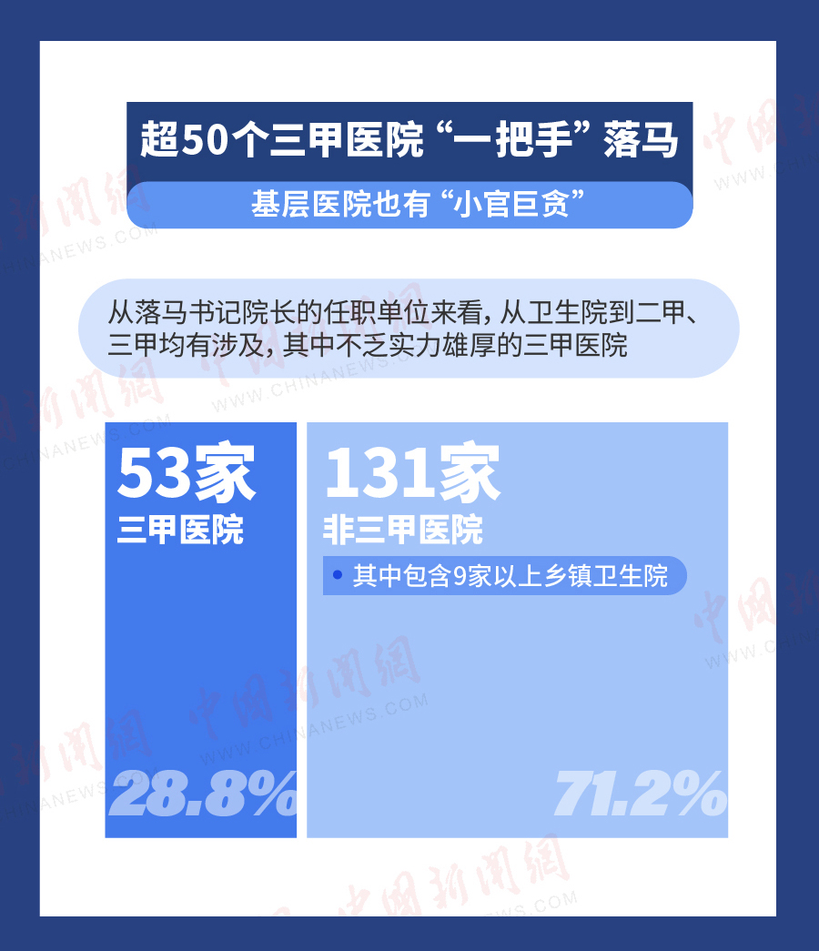 中新网注意到,从落马院长、书记的任职单位来看,从卫生院到知名大医院均有涉及,其中不乏实力雄厚的三甲医院。184人的名单中,至少有53人来自三甲医院。比如首都儿科研究所原党委副书记、所长、首都医科大学附属北京朝阳医院副院长魏永祥,以及8月14日被通报的安徽医科大学第二附属医院原党委书记都鹏飞。