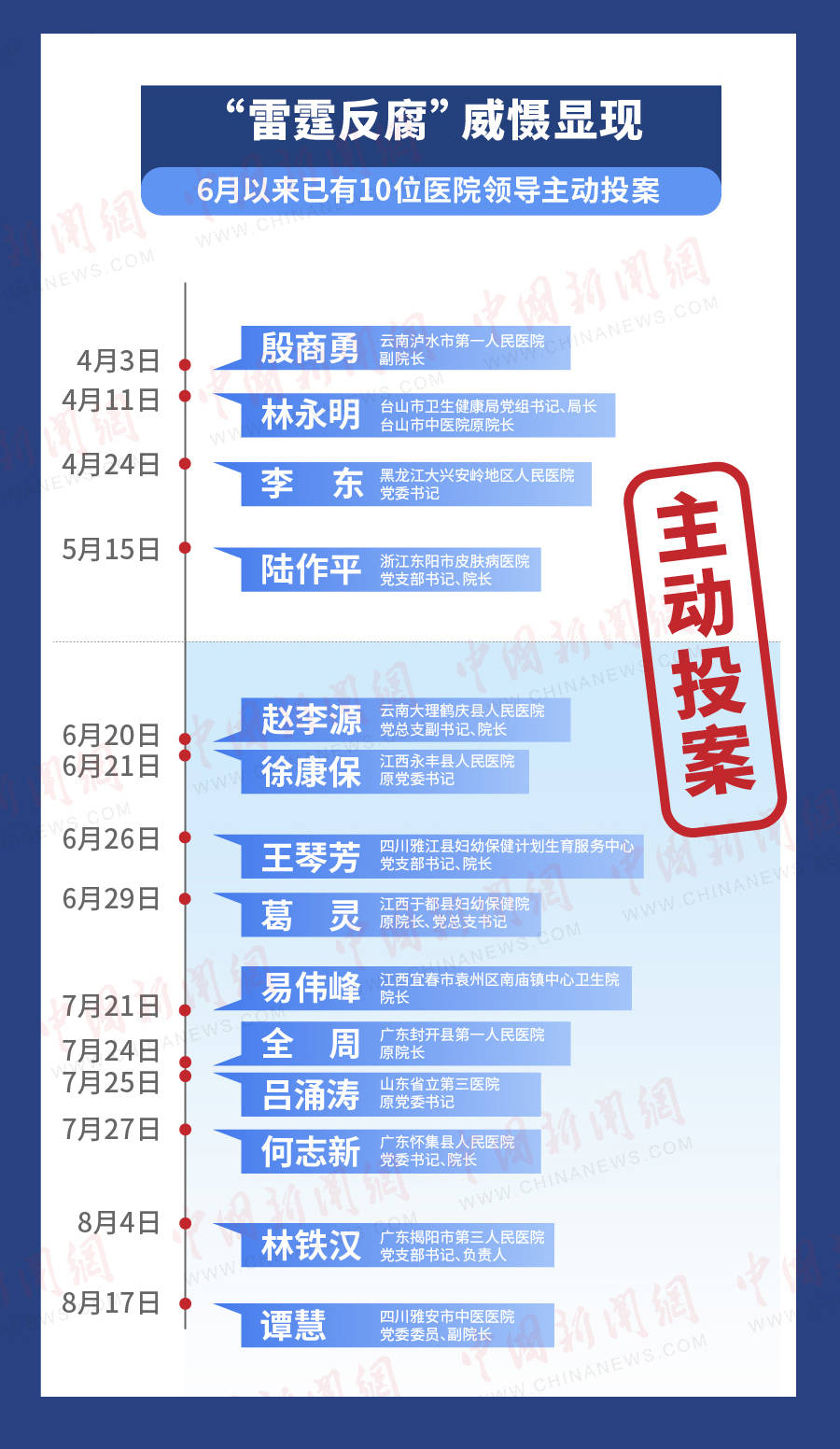 例如,7月25日,据山东省纪委监委网站消息,山东省立第三医院原党委书记吕涌涛涉嫌严重违纪违法,主动投案,接受审查调查。