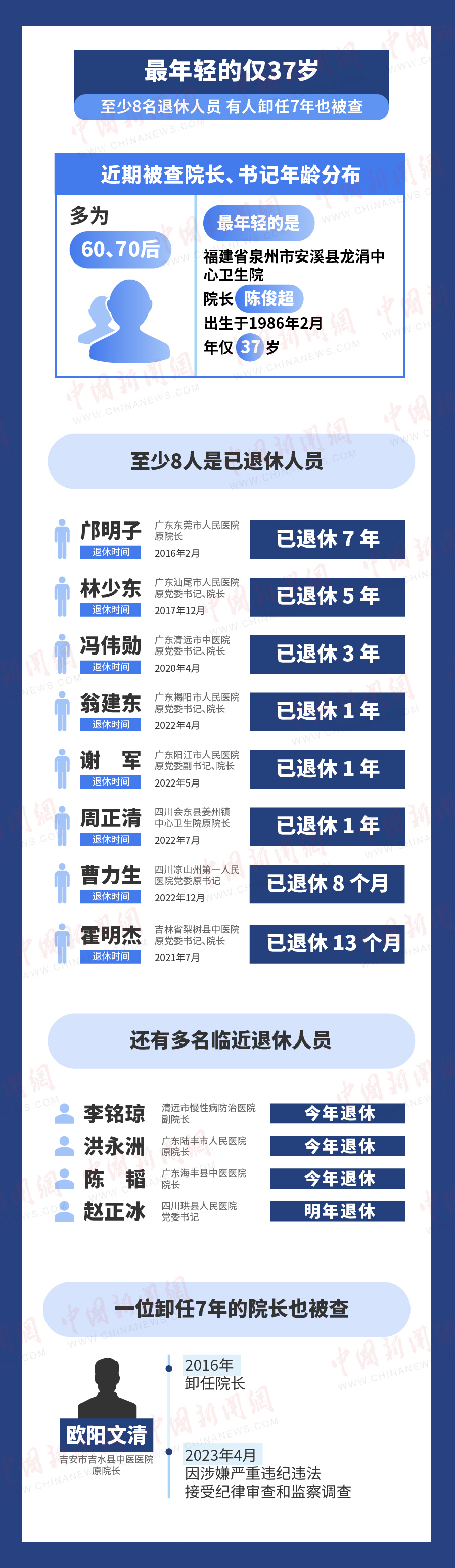 这份名单中,至少8人是已退休人员。如四川凉山州第一人民医院党委原书记曹力生; 广东汕尾市人民医院原党委书记、院长林少东;广东东莞市人民医院原院长、东莞市政协原副主席邝明子;广东阳江市人民医院原党委副书记、院长谢军;四川会东县姜州镇中心卫生院原院长周正清等。此外,还有多名临近退休人员。比如广东陆丰市人民医院原院长洪永洲(今年退休),四川珙县人民医院党委书记赵正冰(明年退休)。