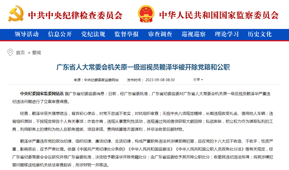 广东省人大常委会机关原一级巡视员赖泽华被开除党籍和公职