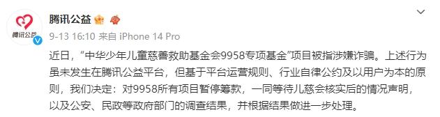 9月13日,腾讯公益慈善基金会发布通报,回应中华儿慈会千万救助款疑被卷走一事,表示对9958所有项目暂停筹款,等待调查结果。