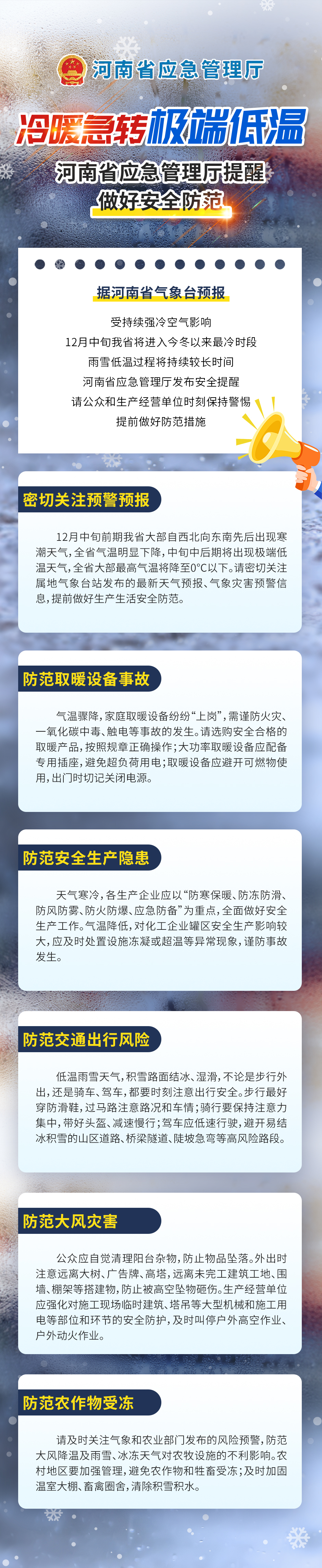 大河网讯 据河南省气象台预报,受持续强冷空气影响,12月中旬我省将进入今冬以来最冷时段,雨雪低温过程将持续较长时间。河南省应急管理厅发布安全提醒,请公众和生产经营单位时刻保持警惕,提前做好防范措施。 密切关注预警预报。12月中旬前期我省大部自西北向东南先后出现寒潮天气,全省气温明显下降,中旬中后期将出现极端低温天气,全省大部最高气温将降至0℃以下。