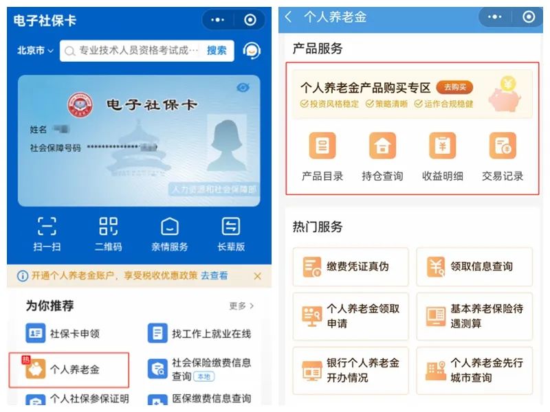 参加人可通过全国统一线上服务入口(国家社会保险公共服务平台、全国人力资源和社会保障政务服务平台、电子社保卡、掌上12333APP等)或者商业银行渠道,在信息平台开立个人养老金账户;然后选择一家商业银行开立或者指定本人唯一的个人养老金资金账户,也可以通过其他符合规定的个人养老金产品销售机构指定。