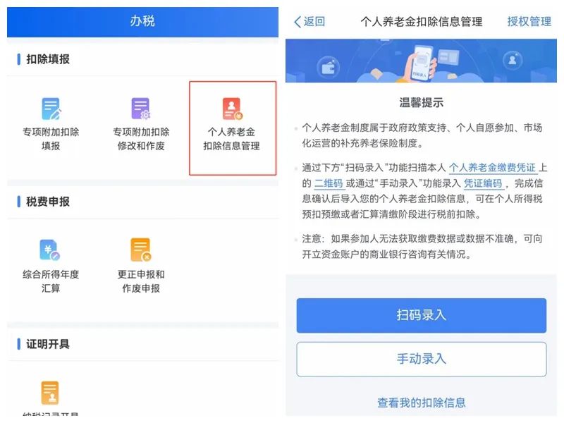此后,进入个人所得税APP“办税”频道,点击“个人养老金扣除信息管理”功能,通过“扫码录入”和“手动录入”录入凭证编码,完成信息确认后导入本人的个人养老金扣除信息,即可在个人所得税预扣预缴或者汇算清缴阶段进行税前扣除。