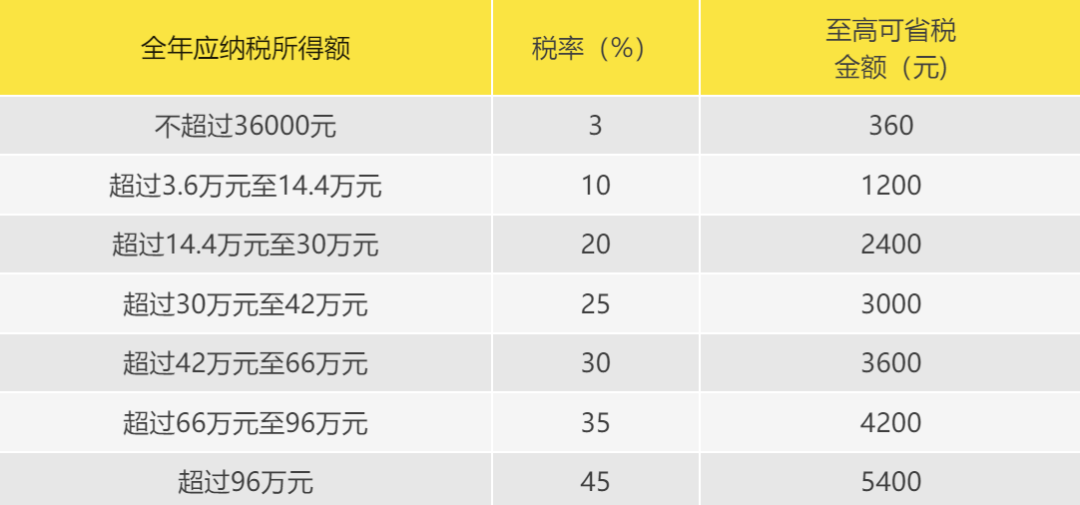 个人养老金缴存金额越多,税收优惠金额越多,根据个人的收入水平,每年最高可省360元至5400元不等,具体可以参考下面表格: