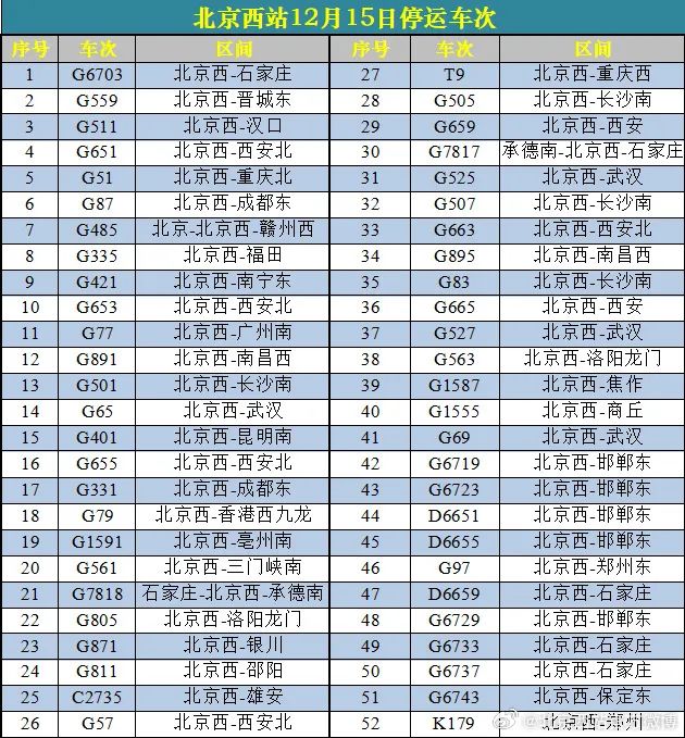 据铁路郑州站微博消息,受降雪影响,12月15日,途经郑州车站的部分开往西安、上海等方向的列车停运;途经郑州东站的部分开往北京、西安、上海等方向列车停运。由此给您带来的不便,铁路部门表示歉意。已购停运列车车票的旅客,可在票面乘车日期起(含当天)30日内到全国任意火车站退票窗口或通过12306客户端免费办理退票手续。