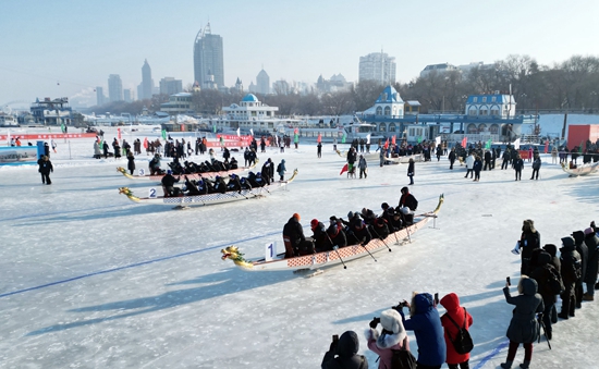 1月7日,哈尔滨,“爱冰雪、迎亚冬、向未来”2024哈尔滨市职工冰上龙舟、冰帆、雪地足球比赛,在九站公园松花江冰冻江段“职工冰雪乐园”举行。视觉中国供图