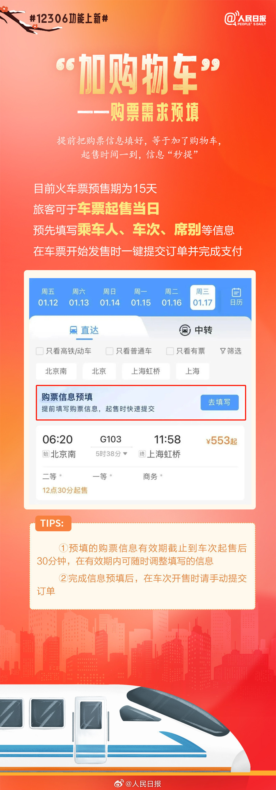 2月第一天车票将于明日开售。今年春运买火车票有啥不一样?购票需求预填,提前“加购物车”;起售提醒订阅,“自带闹钟”;候补购票功能升级,最多可选60个车次;新增学生务工人员专区预约购票……更多点击查看↓↓收藏,周知!