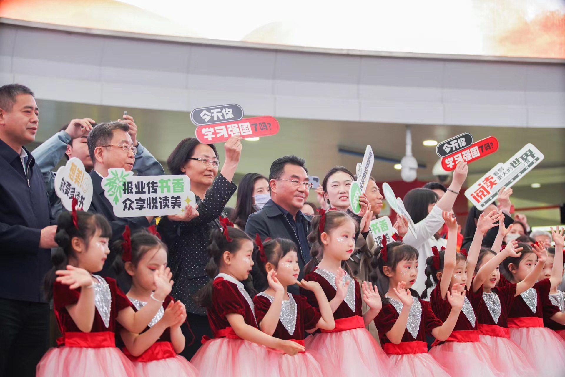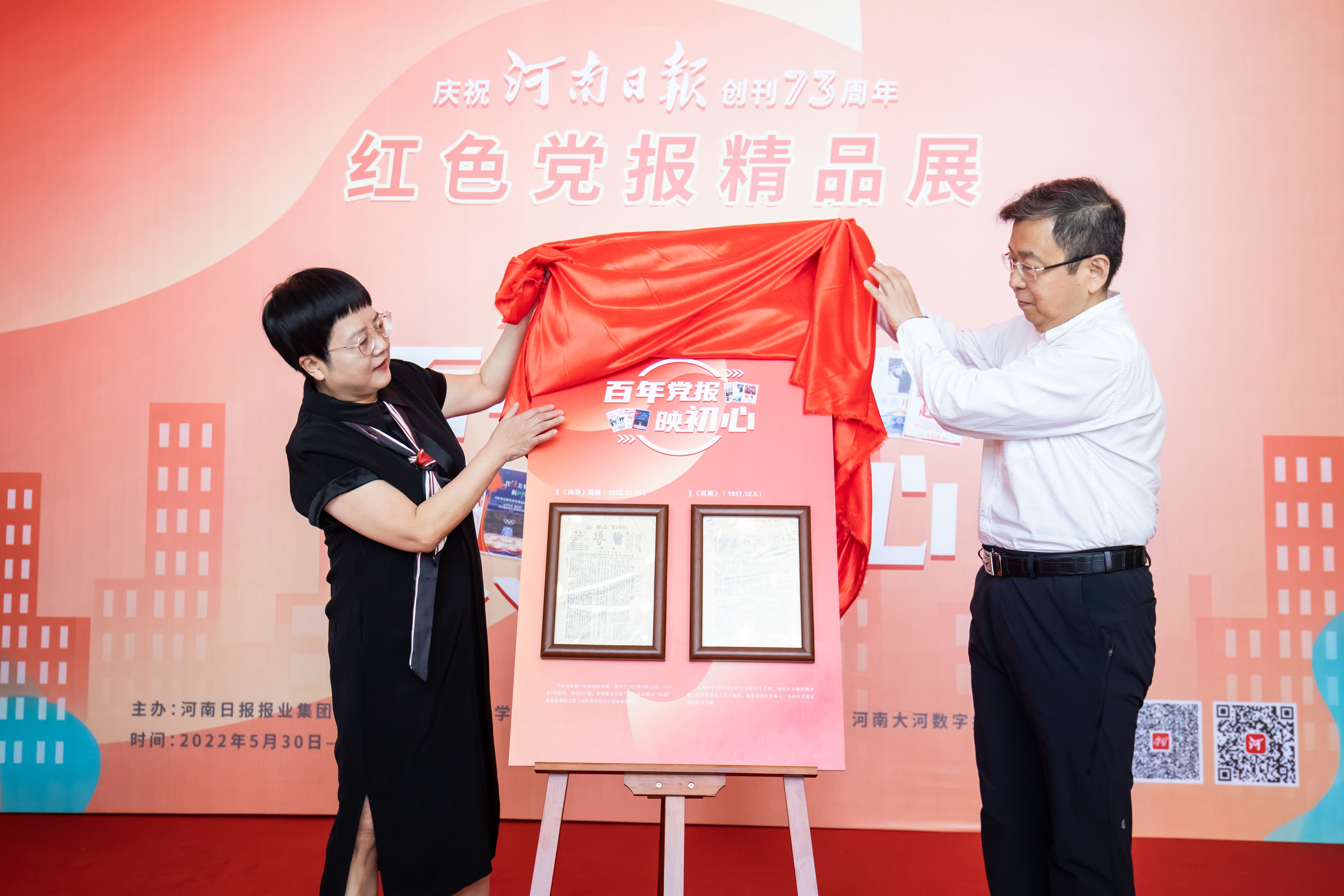 河南日报社党委书记、社长刘雅鸣(左)为“学习强国”河南学习平台承办的集报展揭牌