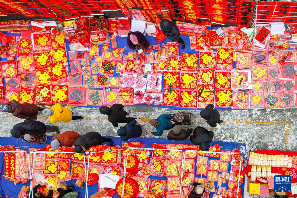 1月22日,人们在山东省青岛市李村大集选购春节饰品(无人机照片)。春节临近,各地张灯结彩。人们逛花市、赏花灯、置办年货,年味渐浓。新华社发(张鹰摄)