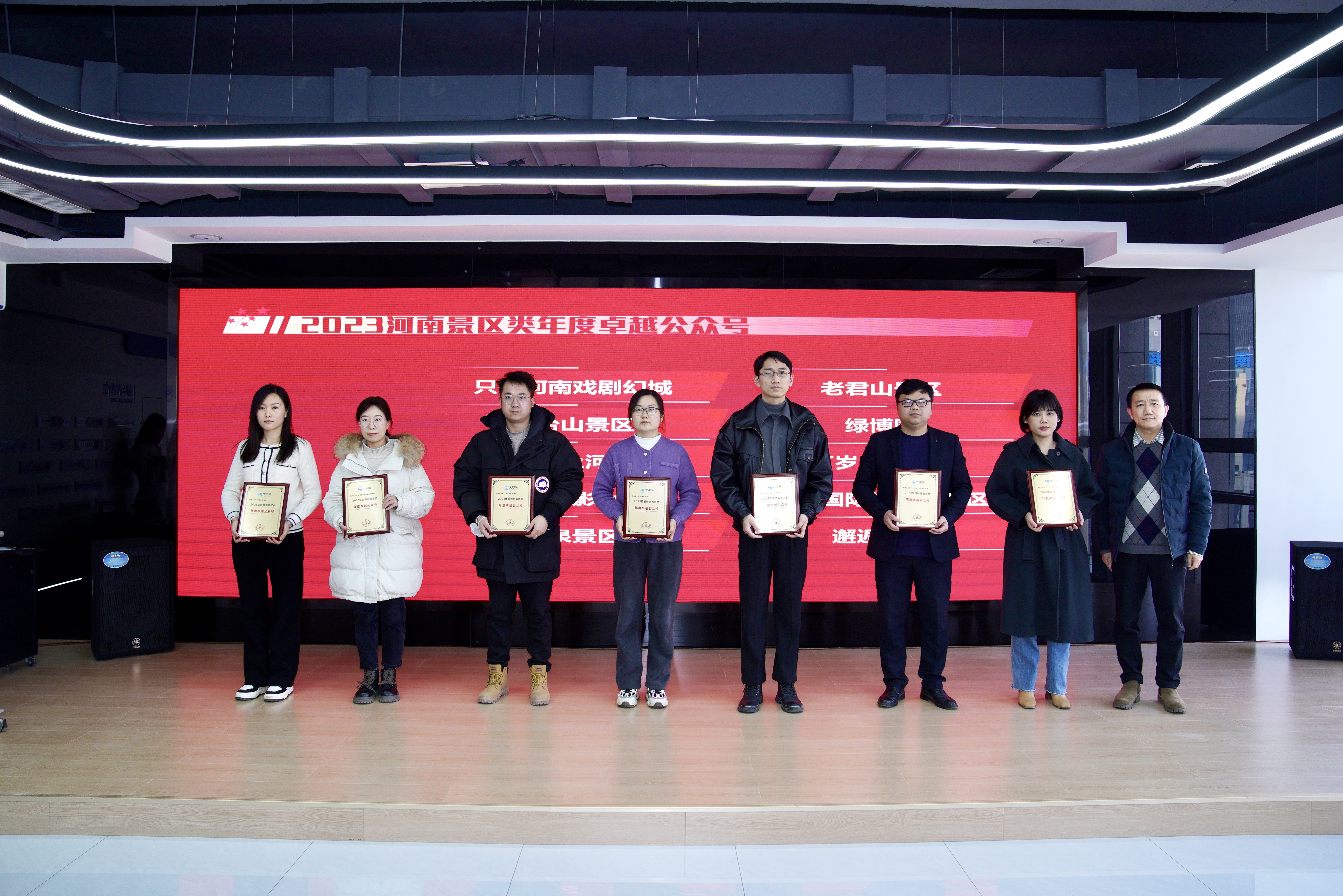 获得2023河南政务微信影响力·景区类年度卓越公众号的分别是:只有河南戏剧幻城、云台山景区、开封清明上河园景区、建业电影小镇、宝泉景区、老君山景区、绿博园、万岁山武侠城、银基国际旅游度假区、邂逅隋唐。