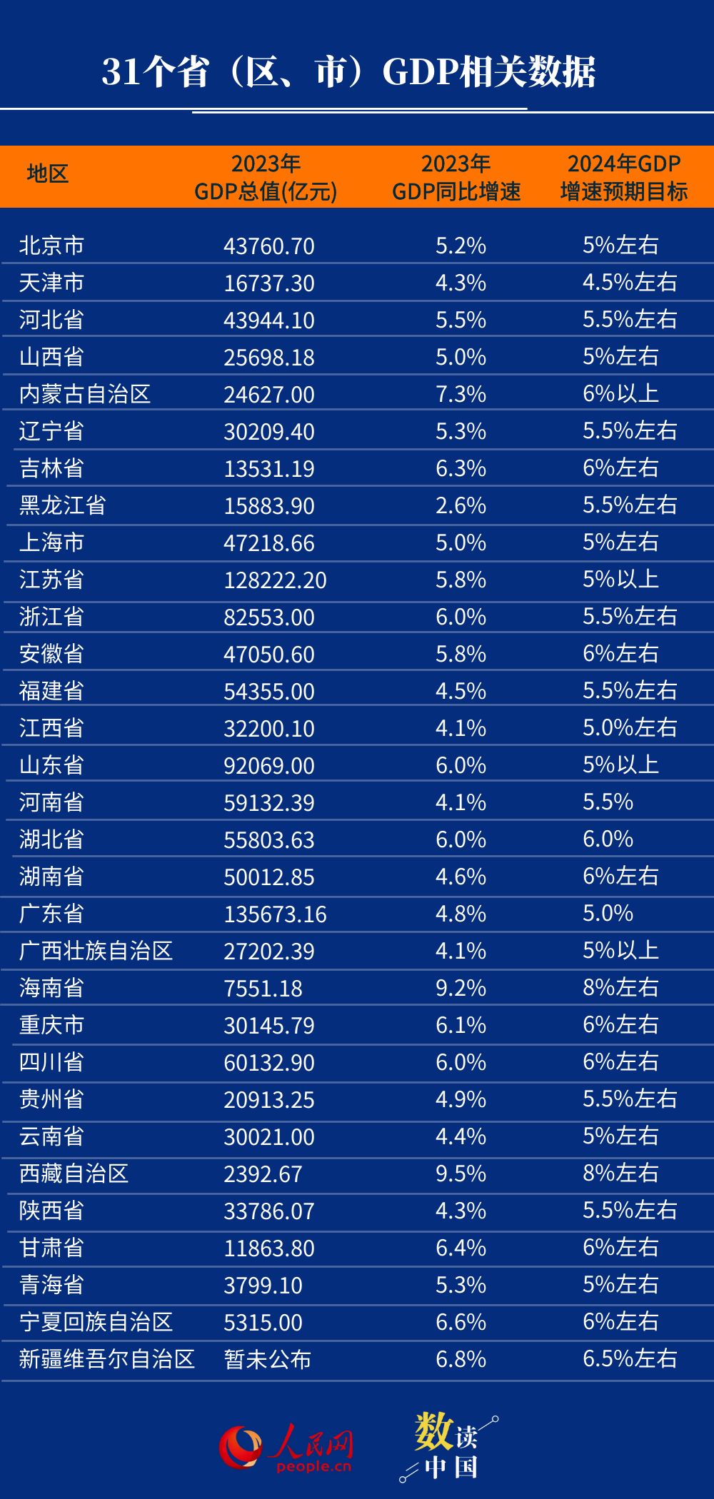人民网北京1月31日电 (记者 杨曦)随着地方两会的密集召开,各地陆续公布2023年经济发展“成绩单”。截至目前,31个省份2023年GDP增速已全部出炉,并公布2024年GDP增速预期目标。