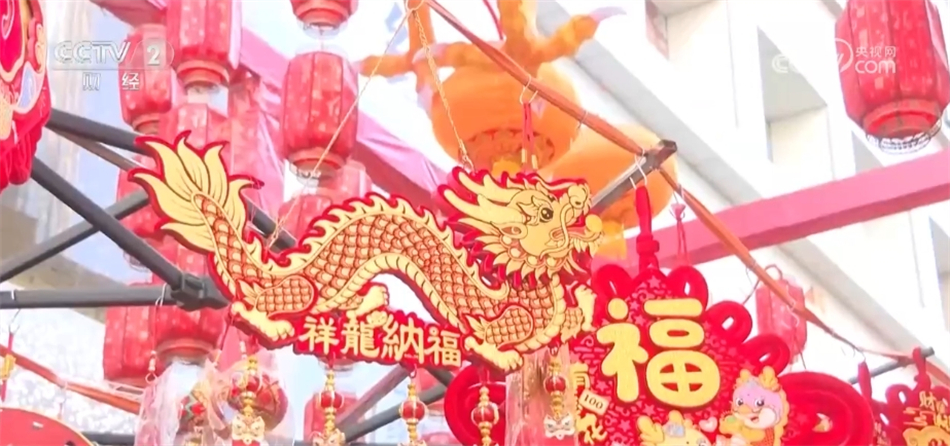 年集现场,不少商家还将带有龙元素的新年小物件摆放在醒目位置,包括福字贴、红灯笼、龙玩偶、新年摆件等,无数个红彤彤的小挂件营造出浓厚的新年氛围,吸引不少市民购买。