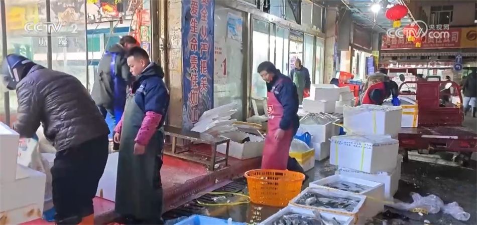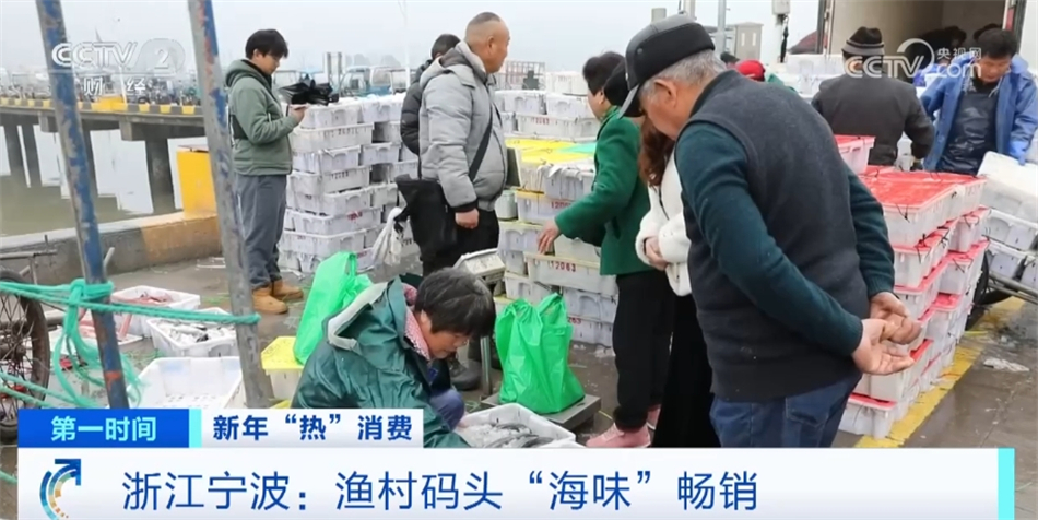 浙江宁波奉化区莼湖街道的渔村码头也进入了年前最后的繁忙时刻。上午八点,5艘运输船停靠在内外码头上,据了解,一艘运输船有七八千箱渔获物,近八成是带鱼。最近每天有百万斤东海鱼货就地销售或运往全国各地,预计将持续至腊月二十七。在码头边桐照鱼市场的摊位上,色泽鲜亮的带鱼、鲳鱼、大黄鱼等海产品琳琅满目,市民们忙着挑选,渔商们则卖力吆喝着。