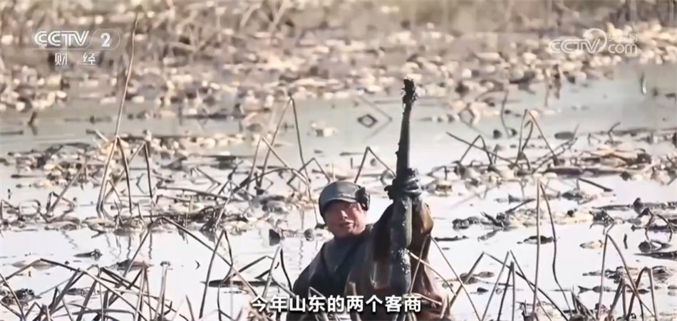 江苏省淮安市洪泽区岔河镇莲藕种植户 王金:我今年长了100亩河藕,今年这个春节前市场需求量很大,山东的两个客商跟我订了20万斤藕。