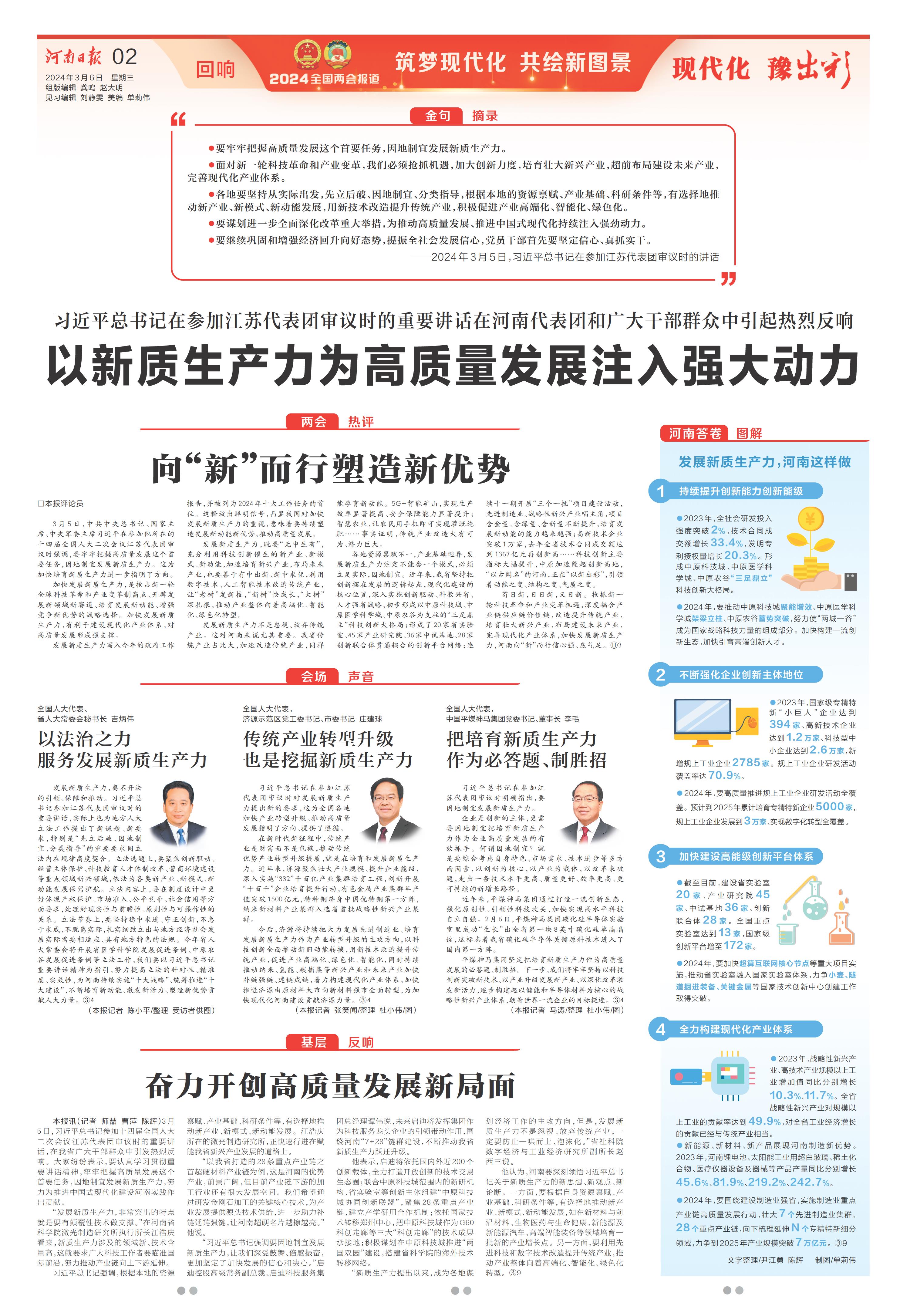 3月5日,习近平总书记参加十四届全国人大二次会议江苏代表团审议时的重要讲话,在我省广大干部群众中引发热烈反响。大家纷纷表示,要认真学习贯彻重要讲话精神,牢牢把握高质量发展这个首要任务,因地制宜发展新质生产力,努力为推进中国式现代化建设河南实践作出贡献。