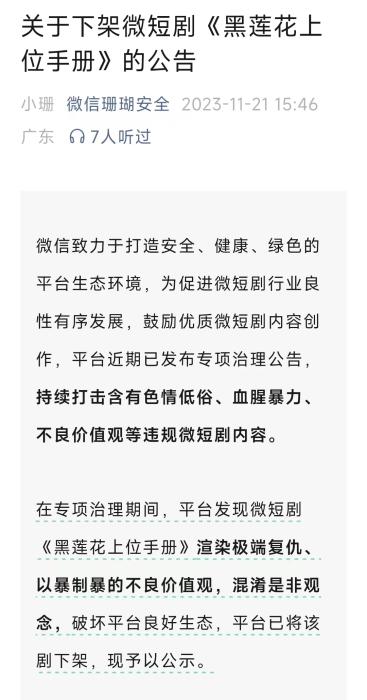 然而,良莠不齐一直是微短剧的行业痛点。2023年11月,《黑莲花上位手册》上线一周之内被平台下架。