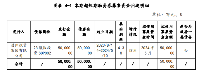 本期债券简称“24濮阳投资SCP001”,发行规模5亿元,利率2.77%,期限为90日;债券起息日为2024年4月30日,兑付日为2024年7月29日;薄记管理人/主承销商为郑州银行。本期债券募集资金拟用于偿还有息债务。