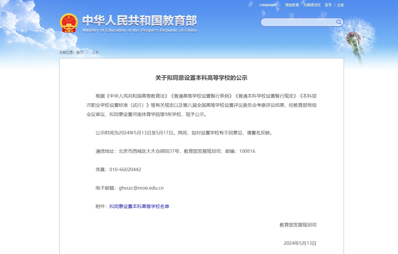 据教育部网站,根据《中华人民共和国高等教育法》《普通高等学校设置暂行条例》《普通本科学校设置暂行规定》《本科层次职业学校设置标准(试行)》等有关规定以及第八届全国高等学校设置评议委员会考察评议结果,经教育部党组会议审议,拟同意设置河南体育学院等9所学校,现予公示。公示时间为2024年5月13日至5月17日。