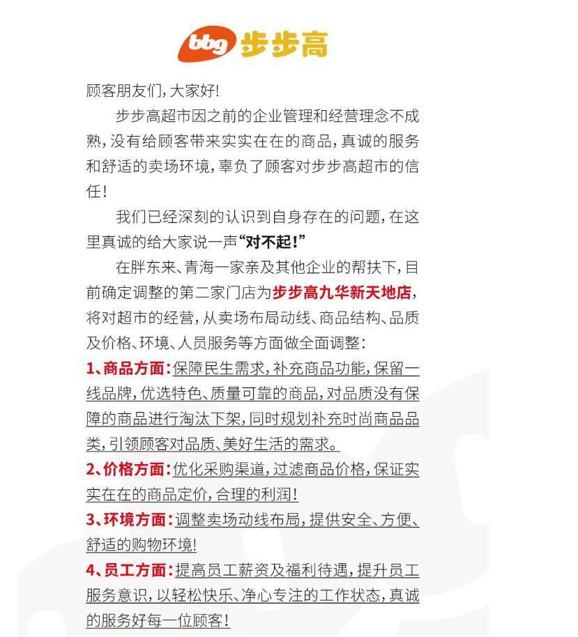 下一步,胖东来团队将在超市产品结构、团队服务等方面对步步高超市九华店进行调改,力争为顾客带来更有品质、更有保障、价格更实在的商品,提供更安全、方便和舒适的环境与真诚的服务。