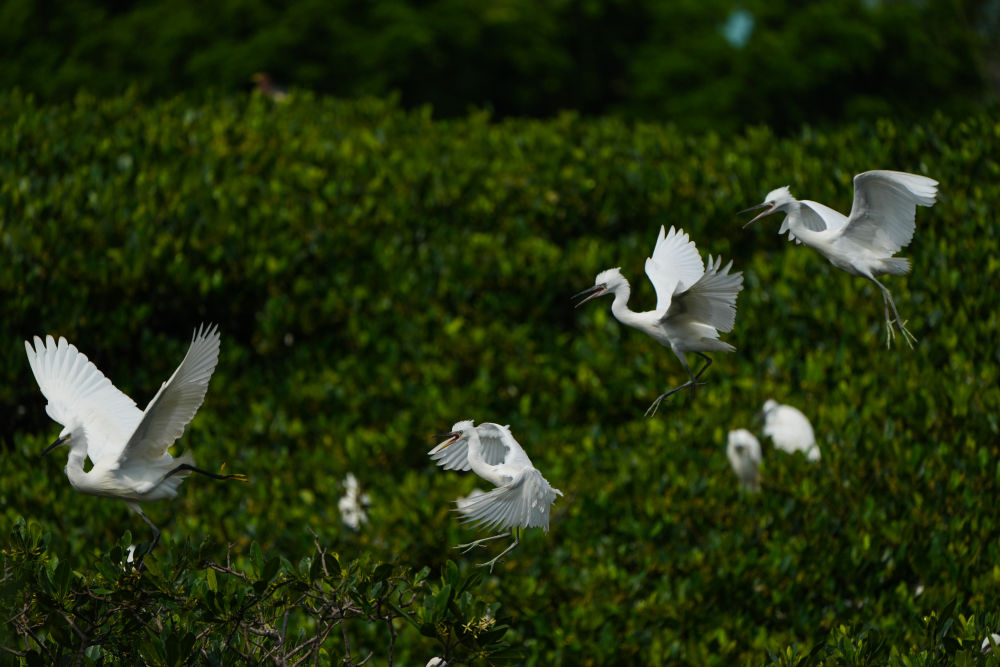 鹭鸟在广东湛江金牛岛的红树林上栖息(2024年5月17日摄,无人机照片)。广东湛江红树林国家级自然保护区,是中国面积最大、分布最集中的红树林自然保护区,是世界湿地生态恢复的成功范例。