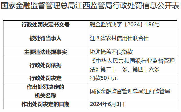 【大河财立方消息】6月11日,据国家金融监督管理总局江西监管局消息,江西省农村信用社联合社因协助掩盖不良贷款被罚50万元。