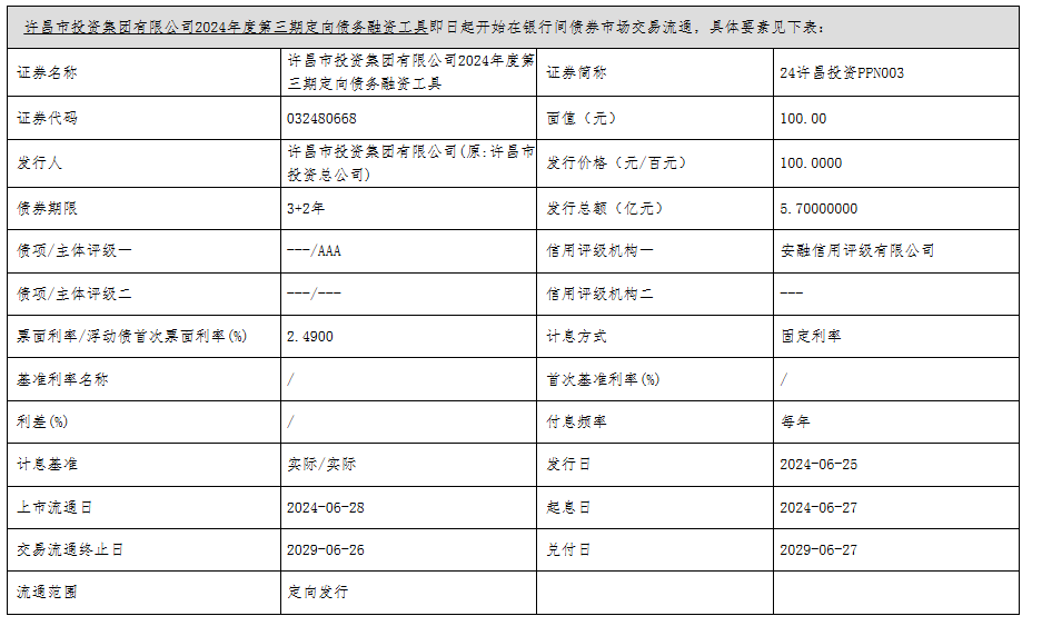 【大河财立方消息】6月27日,许昌市投资集团有限公司披露2024年度第三期定向债务融资工具发行情况。