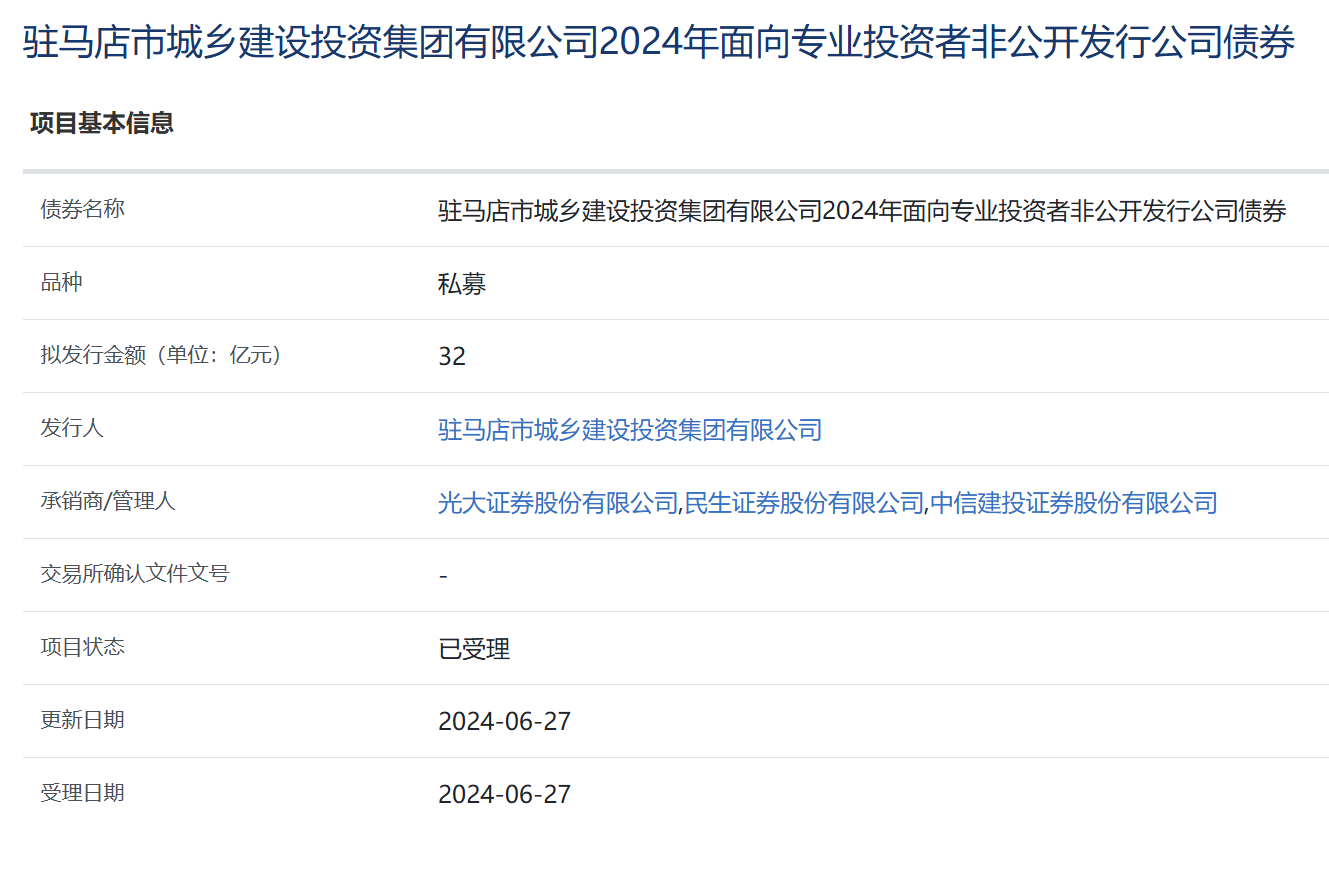 【大河财立方消息】6月28日消息,驻马店市城乡建设投资集团有限公司2024年面向专业投资者非公开发行公司债券项目日前获上交所受理。