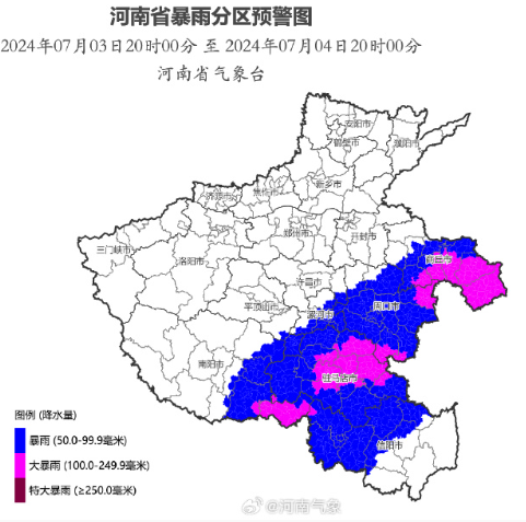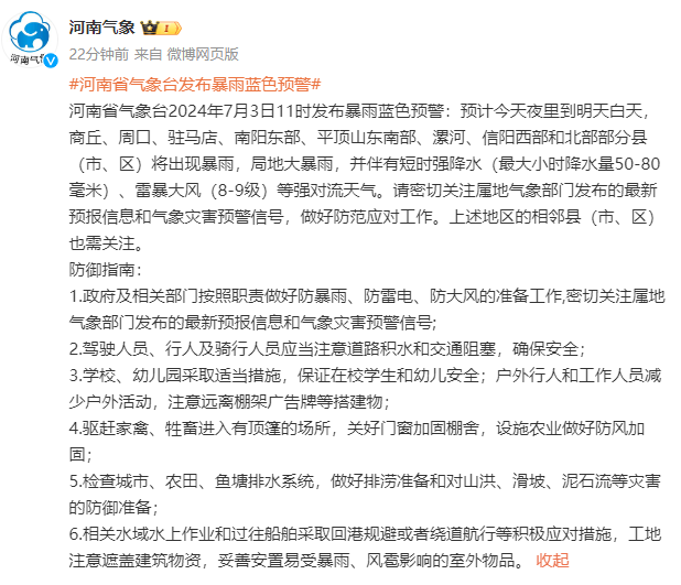 【大河财立方消息】河南省气象台2024年7月3日11时发布暴雨蓝色预警:预计今天夜里到明天白天,商丘、周口、驻马店、南阳东部、平顶山东南部、漯河、信阳西部和北部部分县(市、区)将出现暴雨,局地大暴雨,并伴有短时强降水(最大小时降水量50-80毫米)、雷暴大风(8-9级)等强对流天气。