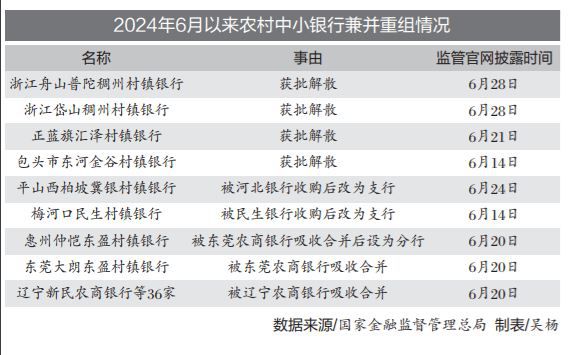 农村中小银行获批解散或吸收合并频现。中国证券报记者梳理发现,今年6月以来,金融监管总局公布了4家农村中小银行解散的批复;另外,40家农村中小银行被吸收合并或收购,资产、负债等被收购银行承接。