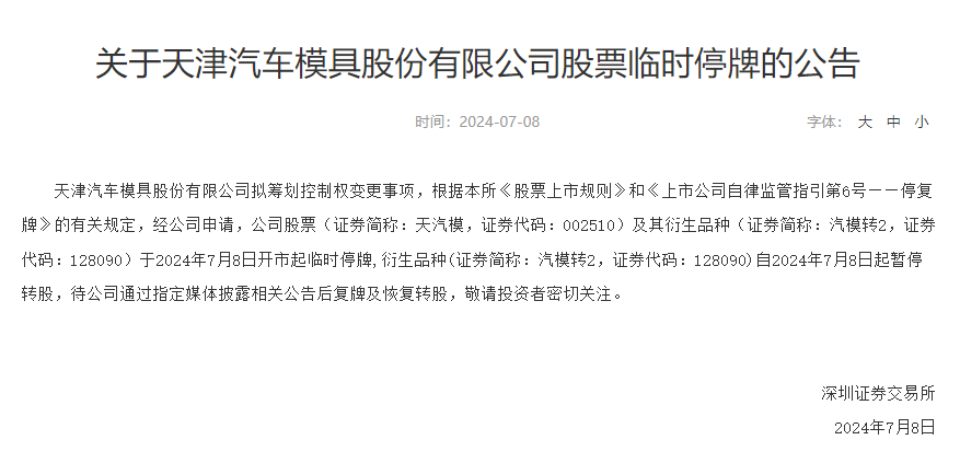【大河财立方消息】7月8日,深交所公告,天津汽车模具股份有限公司拟筹划控制权变更事项,经公司申请,公司股票及其衍生品种于2024年7月8日开市起临时停牌,衍生品种自2024年7月8日起暂停转股,待公司通过指定媒体披露相关公告后复牌及恢复转股。